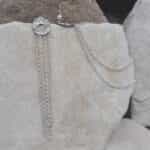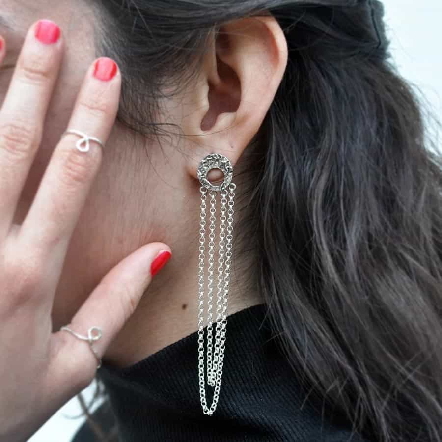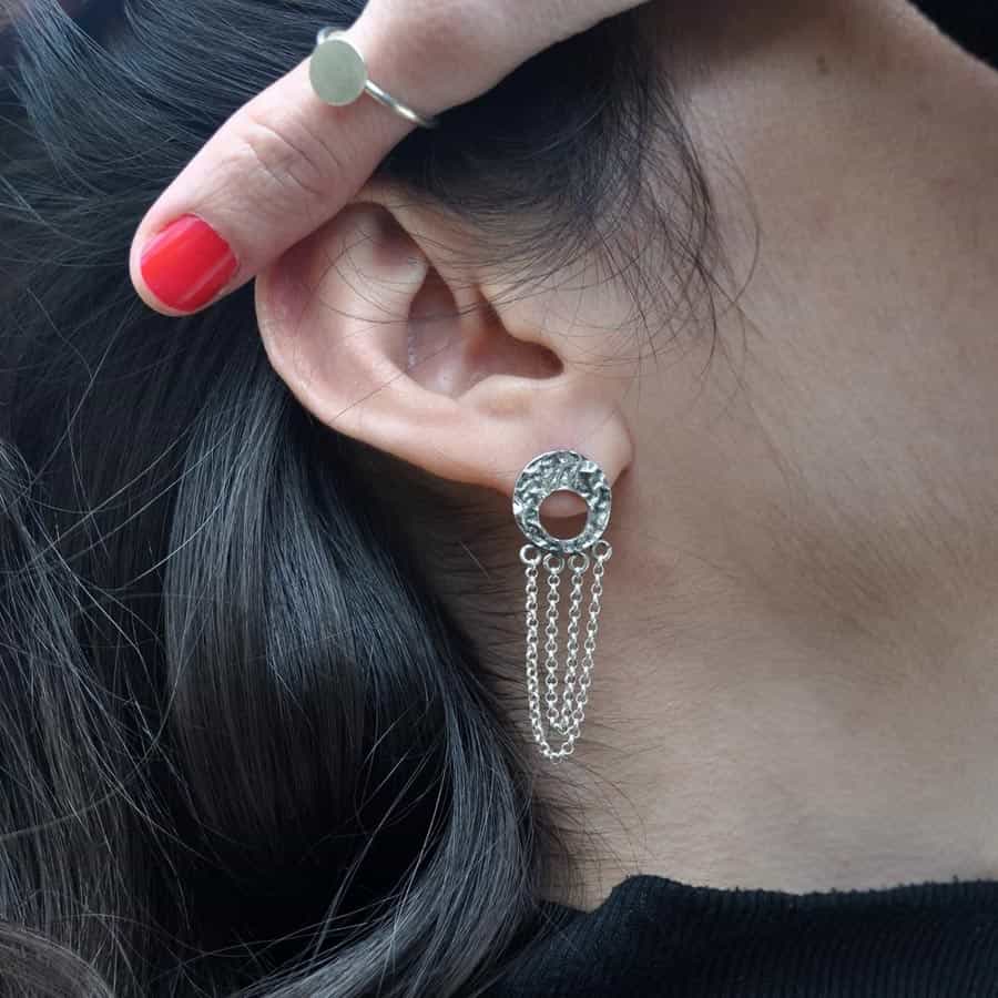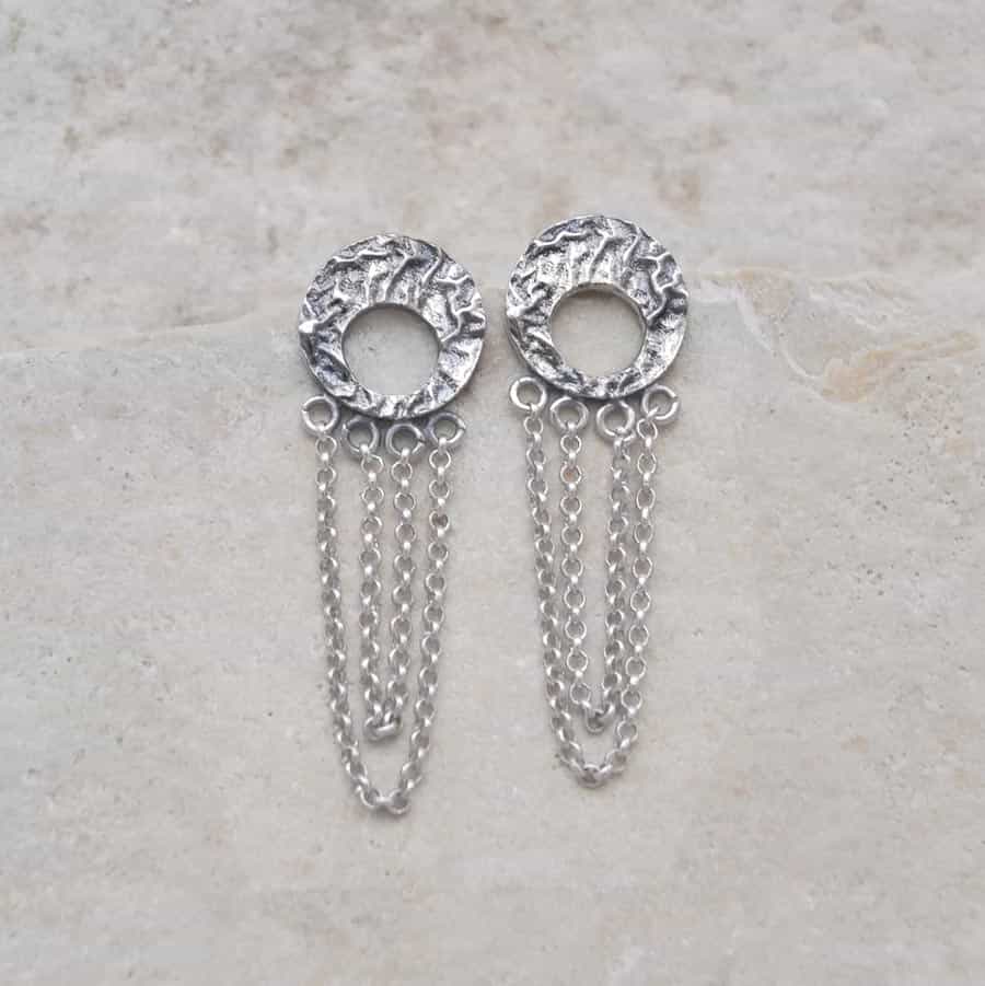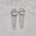 The round elements from which the chains dangle are crafted from solid sterling silver and feature a stud for wearing.