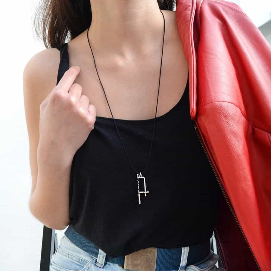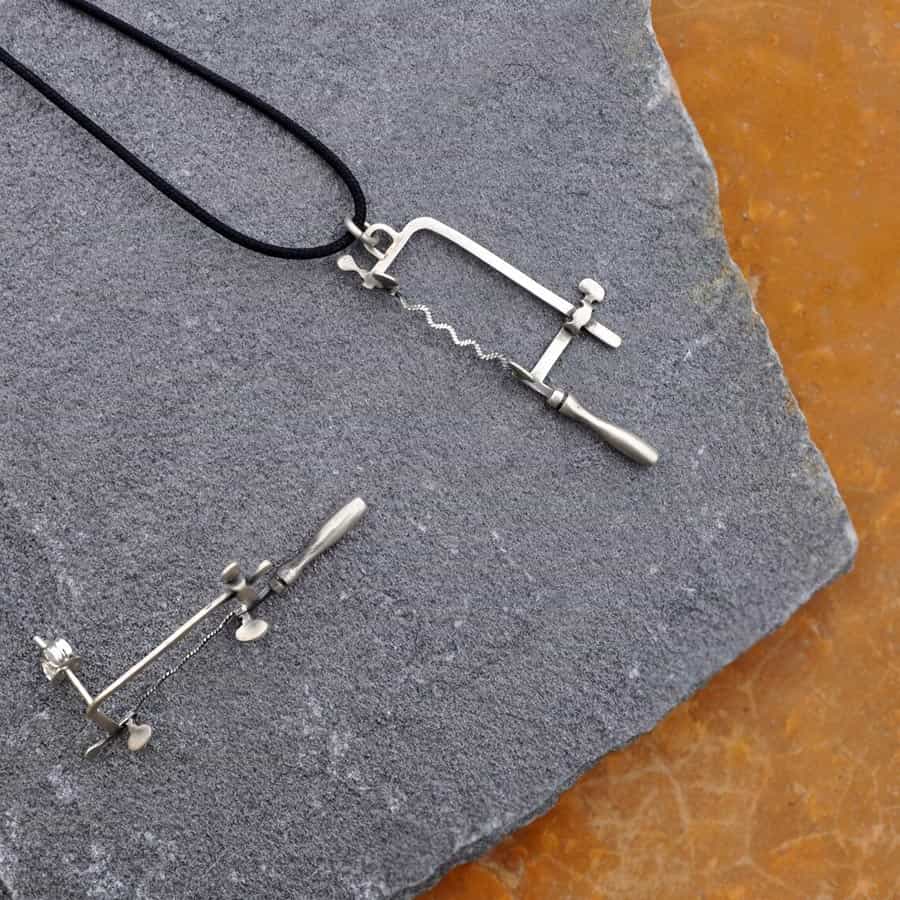 The Jeweler’s Saw as a sterling silver miniature jewelry, specifically as a silver handmade pendant.